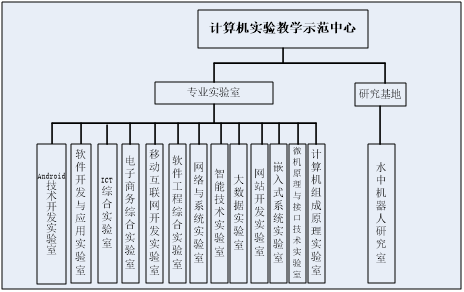 中心现已形成覆盖软件开发、数据与智能、网络与系统、嵌入式与硬件、电子商务等多个领域的实验室体系,共拥有13个专业实验室和1个研究基地,具体包括:Android技术开发实验室、软件开发与应用实验室、ICT综合实验室、电子商务综合实验室、移动互联网开发实验室、软件工程综合实验室、智能技术实验室、网络与系统实验室、大数据实验室、网站开发实验室、嵌入式系统实验室、微机原理与接口技术实验室、计算机组成原理实验室以及水中机器人研究室。