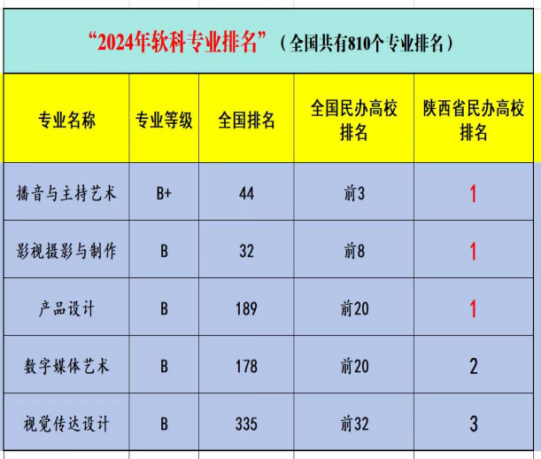 学院本科专业实力雄厚,在最新“2024软科中国大学专业排名”中,学院5个艺术类本科专业全部上榜,位居全国高校前10-30%(B+)和30-50%(B),成绩斐然。播音与主持艺术专业评级B+,进入全国民办第二名,位居陕西民办高校第一;产品设计和影视摄影与制作两个专业评级B,均位居陕西民办高校第一;数字媒体艺术和视觉传达设计两个专业评级B,分别位居陕西民办高校第二和第三。