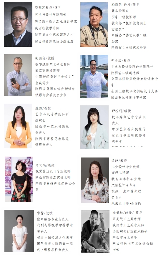 学院高度重视师资队伍建设,已形成名师领衔、中青年为骨干、专兼结合、结构合理、素质优良的教学团队。教学院现有自有专任教师81人,外聘兼任教师6人,其中教育部专业教学指导委员会副主任1人,陕西省教学名师2人,陕西省文化艺术领军人才1人,中国工艺美术大师1人,陕西省工艺美术大师2人,国家高级摄影师6人,陕西省语言文字专家2人。高级职称教师31人,占比38.27%,硕士及以上学历的教师比例达到96.30%。此外,还聘请国家首批非物质文化遗产代表性传承人邰立平先生为客座教授、聘请著名摄影家和摄影教育家柏雨果教授为学院大师工作室特聘教授,并聘请10余位来自各大高校、企业、行业的学者专家来院任教。